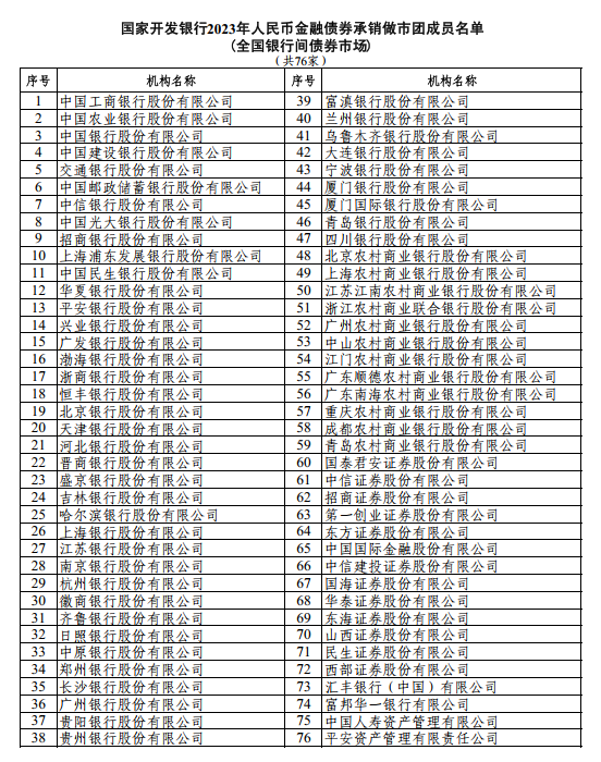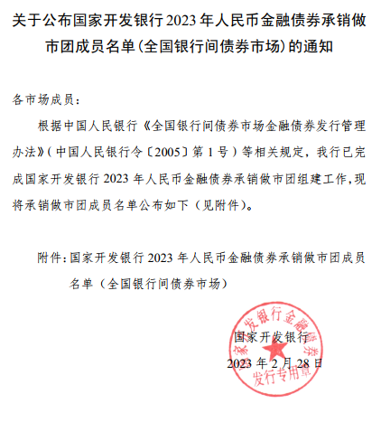 关于公布国家开发银行2023年人民币金融债券承销做市团成员名单(全国银行间债券市场)的通知-凯发棋牌