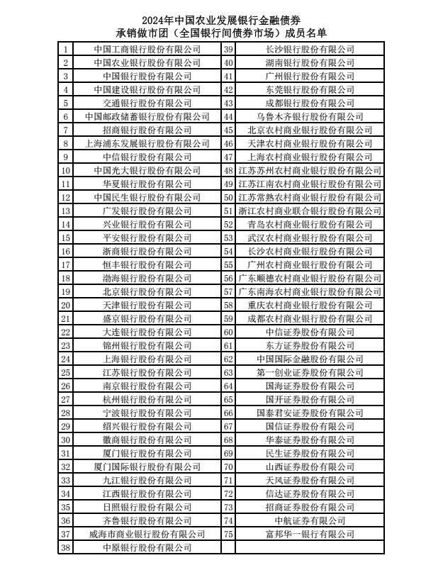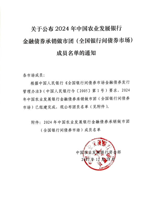 关于公布2024年中国农业发展银行金融债券承销做市团(全国银行间债券市场)成员名单的通知-凯发棋牌