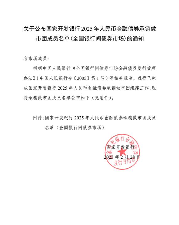 关于公布国家开发银行2025年人民币金融债券承销做市团成员名单(全国银行间债券市场)的通知-凯发棋牌